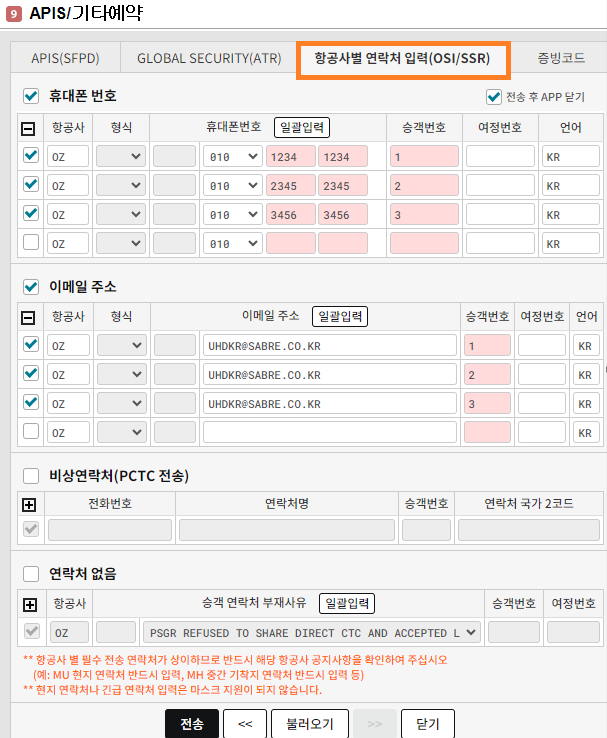 2. 항공사별 연락처 입력 (OSI/SSR)