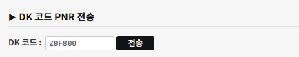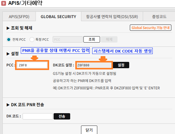 ② PNR 조회 ③ DKZ0F800 입력 -> ER로 저장 -> 아래와 같이 Global Security -> DK 코드 입력하여 전송도 가능