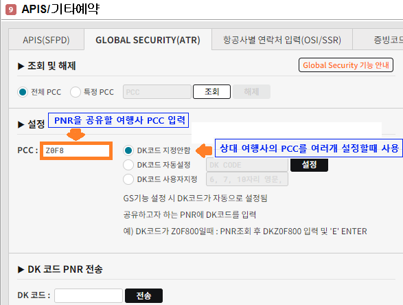 2) ATR 여행사 - 상대방 여행사의 PCC를 여러개 설정해야 하는 경우 -> DK코드 지정안함 선택하여 설정 - 이렇게 설정하는 경우 PNR의 추가 입력없이 상대방 여행사에 공유 가능