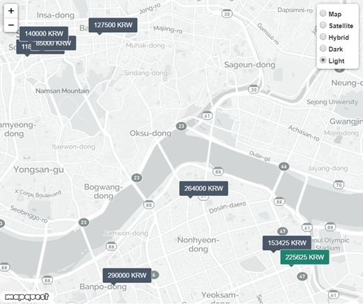 # 지도에서 금액 클릭하면 우측 리스트 상 해당 호텔로 이동하며 반대로 호텔을 클릭하면 지도에서 초록색으로 표시됨