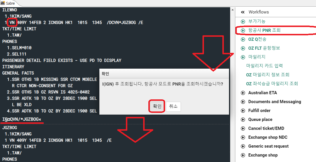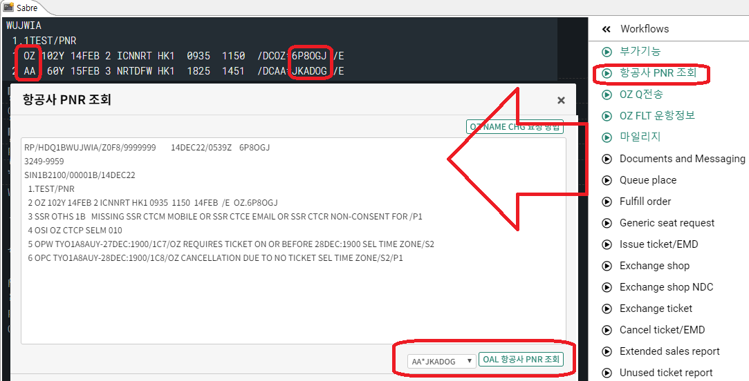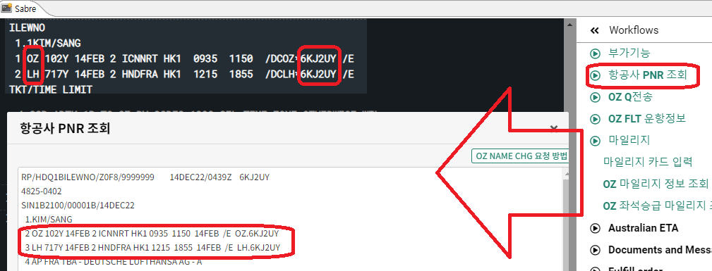 2) OZ+OAL(1A 항공사가 아닌 경우) - OZ PNR 조회 후 하단 클릭하여 OAL 항공사 모드로 PNR 조회 지시어 전송
