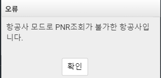 4) @Q 안되는 항공사 여정만 있는 경우 - 항공사 PNR 조회 클릭 시 아래와 같은 확인창 팝업