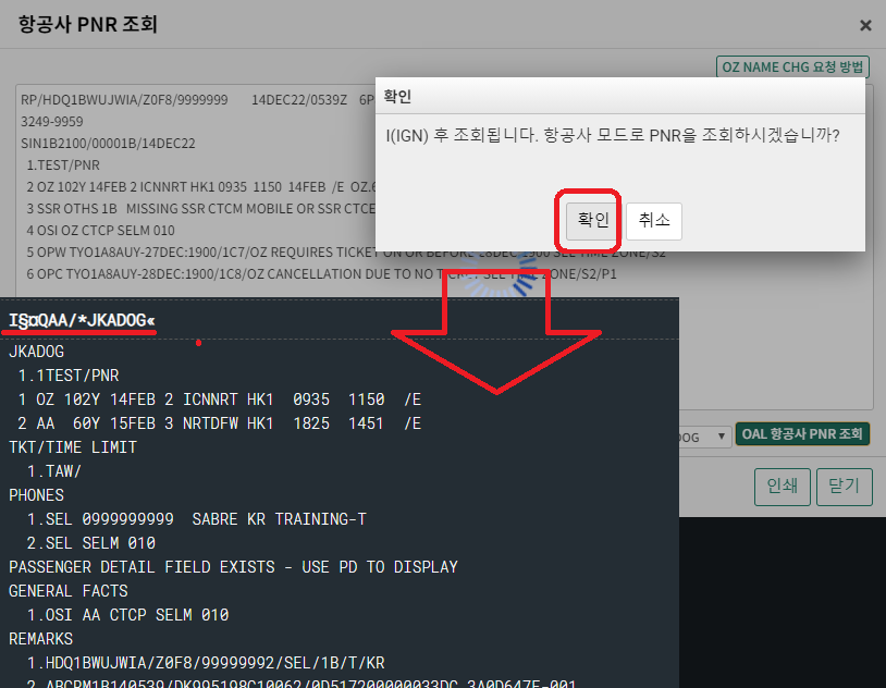 1) OZ+OAL(같은 1A 항공사) 조회 - OZ PNR 조회화면에서 함께조회됨